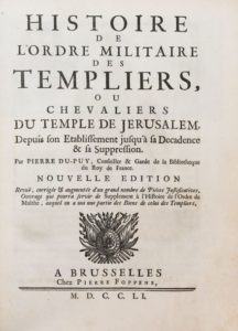 [Malte]. DUPUY (Pierre). Histoire de l'ordre militaire des Templiers, ou chevaliers du Temple de Jérusalem, depuis son établissement jusqu'à sa décadence et sa suppression. Brusselles, chez Pierre Foppens, 1751. In-4° de [4]-8[2]-558 pages, veau marbré, dos à nerfs orné, tr. rouges (reliure de l'époque). Edition augmentée d'un grand nombre de pièces justificatives ; elle est illustrée de 2 belles planches dont une en frontispice (Templier en habit de guerre et Templier en habit de maison) et d'une vignette représentant la condamnation de l'Ordre lors du Concile de Vienne en 1312. Charnières, dos et coins restaurés (Dorbon, 1411- Brunet II, 902). Provenance : Bibliothèque de Beauvais-Raseau (Ex-libris armorié du XVIII°).