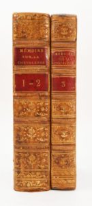[Malte]. LA CURNE DE SAINTE-PALAYE (Jean-Baptiste de). Mémoires sur l'ancienne chevalerie ; considérée comme un établissement politique et militaire. Paris, chez Nic. Bonav. Duchesne, 1759-1781. 3 tomes reliés en 2 volumes in-12 de 11-[1]-391-1bl-[4]-317-[3] et 14-[2]-456 pages, veau marbré, dos à nerfs orné, tr. rouges (reliure ancienne). ÉDITION ORIGINALE de 1759, avec titre de relais pour les deux premiers volumes. Le troisième volume (1781) est titré : Mémoires sur l'ancienne chevalerie et offre les mémoires historiques sur la chasse dans les différents âges de la monarchie. Travail de vers sur une charnière, petites réparations sur qq. feuillets, dos légèrement différents, cachet sur titres. (Thiébaud, 543 - Brunet V, 65).
