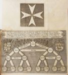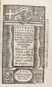 [Malte]. NABERAT (Anne de). Advertissements chrestiens et politiques - Instruction pour faire les preuves de noblesse des Chevaliers de Malte, la forme de donner l'habit, etc... Aix, par Jean Tholosan, 1610. 2 ouvrages de [20]-192-[2]-193 à 267 (mal chiffr.)-[5] pp. et 51-[1] pages et un tableau dépliant, reliés en 1 volume in-12, velin souple (reliure de l'époque). EDITIONS ORIGINALES EXTREMEMENT RARES. 1. Les « Advertissements » commencent par un titre général gravé sur bois ouvrant la première partie « De la Piété », répété pour la seconde intitulée « De la probité » et pour la dernière nommée « De la prudence ». 2. Titre général identique avec la croix de Malte au verso et un grand tableau dépliant intitulé « Instruction et méthode facile pour faire les preuves de la noblesse des Chevaliers de Malte » Deux feuillets mal placés dans le premier livre (Hellwald, ne connait pas le premier texte, p. 232 pour le second livre). (USTC, 6803065, 2 ex.).