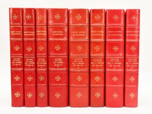 [Malte]. PIERREDON (Michel comte de). Histoire de l'Ordre souverain de Saint-Jean de Jérusalem (Ordre de Malte) depuis 1789. Paris, 1956-2008. 7 tomes reliés en 8 volumes in-8, demi-basane rouge, dos à nerfs orné de croix de Malte dorées (reliure moderne). Rare ensemble ainsi complet. A l'état neuf.