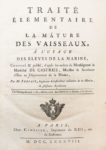 [Voyage - Marine]. FORFAIT (Pierre Alexandre Laurent). Traité élémentaire de la mâture des vaisseaux, à l'usage des élèves de la marine, composé & publié, d'après les ordres de Monseigneur le Maréchal de Castries, Ministre & Secrétaire d'État au Département de la Marine. Paris, chez Clousier, 1788. In-4°, basane marbrée, dos à nerfs orné, tranches rouges (reliure de l'époque). EDITION ORIGINALE destinée aux élèves de la Marine, avec la description de différentes formes de voiles, la manière dont les mâts sont fixés, les bois à faires des mâtures, l'Art de la mâture… Illustré de 24 PLANCHES DEPLIANTES, gravées par Benard. Reliure un peu frottée, 2 mors fendus, rares rousseurs (Polak, 3522).