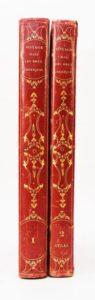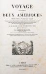[Voyage - Marine]. ORBIGNY (Alcide d'). Voyage pittoresque dans les deux Amériques. Résumé général de tous les voyages de Colomb, Las Casas, Oviedo... Paris, chez L. Tenré, 1836. 2 vol. in-4°, demi-maroquin rouge à long grain, dos lisses ornés en long (reliure de l'époque). « Les gravures de cet ouvrage sont fort curieuses » (Chadenat,143). L'atlas renferme 2 grandes cartes dépliantes (Amérique du nord et du sud) et 134 PLANCHES donnant environ 250 vues, portraits, costumes, types d'indiens…d'après les dessins de M. de Sainson et Jules Boilly. Qq. rousseurs, menus frottis sinon bon exemplaire.