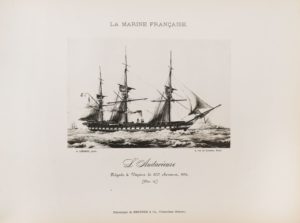 [Voyage - Marine]. PARIS (Amiral). L'OEuvre de François Roux représentant les portraits des navires de la Marine française de 1792 à nos jours. Paris, Liébert, 1885. In-4° oblong, demi percaline bradel violine (reliure de l'époque). Copieuse notice historique et descriptive avec tableaux numériques par l'Amiral Paris suivie de 78 (sur 79, manque la dernière) photographies à pleine page des navires français par A. Liébert. Très bon exemplaire. (Polak, 7340). Provenance : Duc d'Elchingen, prince de la Moskowa, (ex-libris armorié).