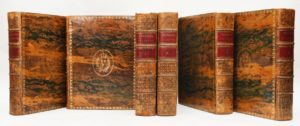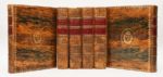 [Voyage - Marine]. ROLLIN (Ch.). Histoire ancienne des Egyptiens, des Carthaginois, des Assyriens, des Babyloniens, des Mèdes et des Perses, des Macédoniens, des Grecs. Paris, chez la veuve Estienne, 1740. 6 volumes in-4°, veau porphyre, guirlande dorée encadrant les plats avec armes au centre, dos à nerfs ornés d'un treillis parsemé d'étoiles et de losanges dorés, tranches dorées (reliure postérieure). Illustré de 12 (sur 13) grandes cartes dressées par le Sieur d'Anville, géographe du Roi, et de nombreux grands bandeaux imagés, dessinés et gravés par J. P. Le Bas. Charnières craquelées, 1 mors fendu, plusieurs pages brunies, galeries de vers sur qq. feuillets. Le portrait et les 3 planches hors-texte manquent. Provenance : Exemplaire aux armes de Louis XVIII (O.H.R., pl. 2497, fer 11).