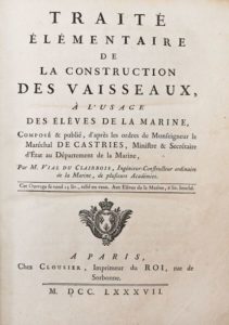 [Voyage - Marine]. VIAL DU CLAIRBOIS (Honoré-Sébastien). Traité élémentaire de la construction des vaisseaux, à l'usage des élèves de la marine, composé & publié, d'après les ordres de Monseigneur le Maréchal de Castries, Ministre & Secrétaire d'État au Département de la Marine. Paris, chez Clouzier, 1787. In-4°, veau marbré, dos à nerfs orné, tranches rouges (reliure de l'époque). Destiné aux élèves, l'auteur décrit avec précision les différentes parties du navire y compris le chevillage, l'opération de le lancer à l'eau où la théorie de l'architecture navale… Orné de 20 PLANCHES DEPLIANTES, gravées par Benard. Quelques rousseurs, planches froissées, coiffes accidentées (Chadenat, 203 - Polak, 9434).