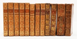 ALMANACH HISTORIQUE DE MARSEILLE. Marseille, Jean Mossy, 1770 à 1777 et 1778-1780-1782-1790. 12 volumes in-16, veau blond pour les 8 premiers et basane pour les autres, dos lisse orné (reliure de l'époque). TETE DE COLLECTION du premier almanach marseillais, rédigé par l'antiquaire Jean-Baptiste Grosson, paru de 1770 à 1790. L'année 1771 est ornée en frontispice d'une gravure repliée représentant la façade de l'hôtel de ville de Marseille, gravée par le peintre et architecte marseillais Jean-Joseph Kapeller.