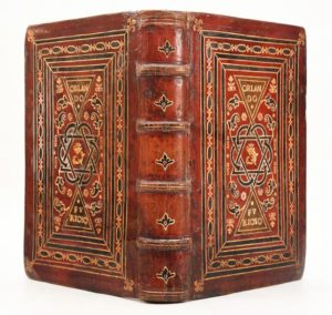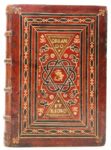 ARIOSTO (L.). Orlando Furioso - Cinque canti di un nuovo libro - Espositione di tutti vocaboli. Vinegia, Giolito de Ferrari, 1548-49. 3 parties de 264 feuillets (A-Z8 ; AA-KK8) - 31-3bl. feuillets (AAA-DDD8) - 30 feuillets (*-***8-*****6), reliées en 1 volume in-4°, veau fauve, listels noirs, entrelacs droits entourant un noeud d'entrelacs avec petit fleurons, fleurs de lys aux angles des plats, titre doré avec dauphin couronné au centre, tranches dorées (reliure de l'époque). MAGNIFIQUE RELIURE DU XVI° SIECLE, dont les plats sont entièrement couverts de filets droits et courbés entrelacés dans le genre des reliures exécutées pour Maioli. Ils sont ornés d'un dauphin couronné, emblème qui peut laisser supposer qu'il a appartenu au Dauphin de France, à qui l'ouvrage est dédié par Giolito de Ferrari. Cette riche reliure, dans le goût oriental par son ornementation, appartient à l'époque de transition pendant laquelle les reliures à filets et arabesques des Grolier et des Maioli furent abandonnées pour faire place ensuite aux reliures dites à la fanfare. Impression en italique sur 2 colonnes illustré d'un titre gravé, de 47 bois pour la première partie, 5 pour le second livre, et du portrait de l'Arioste au début du troisième. Cernes claires en bas des derniers feuillets, l'exemplaire est en belle condition. (USTC 810650).