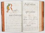 [ARITHMETIQUE]. Arithmétique de Joseph Roux, natif de Roquevaire, apprise et mise dans l'ordre qui suit par le citoyen Jean Baptiste Vérand, arithméticien de Marseille, instituteur à Auriol le 3 Fructidor, An 8 de la République Française. In folio de 624 pages, rédigé à l'encre au recto et au verso, belle écriture parfaitement lisible basane fauve, dos à nerfs orné, tranches rouges (reliure de l'époque). Important manuscrit soigné, de très bonne tenue, contenant l'essentiel de l'arithmétique à connaître à l'époque et nécessaire « A celui qu'on destine pour employer quelque place importante, soit dans les comptoirs des grands négociants, soit dans les bureaux de finances » . La première partie traite des opérations diverses de mathématiques (multiplication, divisions, fractions, réductions, règles de trois, etc…). La seconde, plus concrète, enseigne les diverses règles à savoir : Règles de gain, de perte, traité d'arpentage, pyramides, cadrans, etc... Le tout avec des exemples précis de l'époque et une table générale in fine. La quasi-totalité des pages est ornée d'une composition mise en couleurs avec d'innombrables lettres ornementées, imagées, paraphes, têtes humaines, entrelacs, fleurs, animaux, oiseaux, etc... Bon exemplaire.