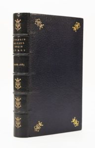 BARY (René). L'esprit de Cour ou les conversations galantes divisées en cent dialogues. Amsterdam chez Jacob de Zetter, 1665. Petit in-12 de [24]-444 pages, maroquin bleu nuit, plats ornés de chiffres couronnés, dos à nerfs orné de même, dentelle intérieure dorée, tranches dorées (Capé). Titre gravé. Curieux ouvrage composé d'entretiens galants, le plus souvent adressés aux femmes où « Si il y en a quelques-unes qui préfèrent le vice à la vertu, leur injuste choix sera plutôt une suite de leur tempérament que de ma licence » ; On y retrouve du reste tous les ridicules des Précieuses de Molière ! (Gay II, 162). Bel exemplaire relié par Capé. Provenances : Marquis Des Perrée de la Villestreux (chiffres couronnés sur la reliure) - Gustave Mouravit (cachet monogrammé sur titre).