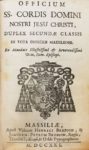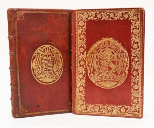 BELSUNCE de CASTELMORON (Mgr. H.F.X.). Mandement de Monseigneur l'Evêque de Marseille portant établissement dans la ville et le diocèse de Marseille d'une fête solemnelle pour implorer la miséricorde de Dieu. Sans lieu ni nom ni date (Marseille, 1753). In-12, maroquin rouge, large dentelle dorée sur les plats avec de grandes armes dorées au centre, dos à nerfs orné, tranches dorées (reliure de l'époque). Une note manuscrite de la main de Mgr Mazenot indique qu'il s'agit de l'exemplaire « dont se servait mon vénérable prédécesseur Mgr Henry de Belsunce pour réciter l'office... » Dos habilement refait. (O.H.R. pl., 2431, fer 2). On joint un autre volume aux armes du même constitué de pièces religieuses et offices du XVII°. Ensemble 2 volumes. Provenance : Exemplaire aux armes de Henry-François-Xavier de Belsunce de Castelmoron. Bibliothèque Paul Arbaud (ex-libris) - Bibliothèque Henri Bonnasse (ex-libris).