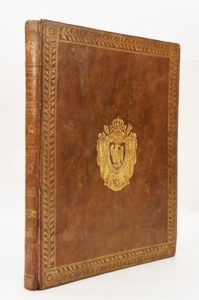BERTHIER (Général). Relation de la bataille de Marengo, gagnée le 25 Prairial An VIII par Napoléon Bonaparte, Premier Consul, commandant en personne l'armée française de réserve, sur les Autrichiens, aux ordres du lieutenant-général Mélas ; rédigée par le général Alex. Berthier, ministre de la guerre. Paris Imprimerie Impériale, 1806. In-4°, veau clair, encadrement au feuillage de lauriers dorés, armoiries impériales dorées au centre, tranches dorées (reliure de l'époque). EDITION ORIGINALE illustrée d'un titre gravé par Vernet représentant Bonaparte à cheval sur le front de bataille, d'un tableau dépliant, d'une carte générale, de 4 cartes dépliantes et d'un panorama replié de la bataille de Marengo. Ex dono manuscrit de SAS le Maréchal Prince Alexandre. Rousseurs, une charnière fendue.