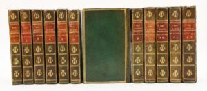 BIBLIOTHEQUE UNIVERSELLE DES DAMES. Seconde classe : Histoire. Bibliothèque du château de Maison-Blanche. Paris, rue d'Anjou-Dauphine, n°6, 1786. 12 volumes petit in-12, maroquin vert sapin, filets dorés sur les plats, dos lisse orné de lyres dorées, tranches dorées (reliure de l'époque). Collection parue de 1785 à1797 et rédigée par une société de gens de lettres, elle fut conçue pour donner une éducation générale, facilement disponible aux femmes d'une certaine classe. Ici les 12 premiers volumes (sur 30) de la catégorie Histoire (Bibliothèque du château de la maison Blanche), rédigée par Jean-Antoine Roucher. (Brunet I, 934 - Barbier I, 421). Quelques traces sur les plats, 2 coiffes accidentées, sinon bel ensemble. Provenance : Bibliothèque Alfred Gélis (ex-libris armorié).