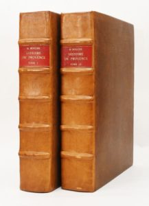 BOUCHE (Honoré). La chorographie ou description de Provence et l'histoire chronologique du mesme pays. Aix, Charles David, 1664. 3 parties reliées en 2 volumes in-folio, basane havane, dos à nerfs (reliure postérieure). EDITION ORIGINALE rare. L'illustration se compose de 3 cartes, dont 2 à double page par Cundier, 1 à pleine page (Provence sous l'Empire romain, carte géographique de la Provence, île de Saint-Honorat et de Sainte-Marguerite) et de nombreux portraits et gravures in-texte, certaines à mi-page. Exemplaire avec le titre en photocopie, manque le titre gravé, le frontispice et les pages 933-934. Quelques pages remontées, réparations sur plusieurs feuillets, rousseurs et cernes clairs en marge. Exemplaire enrichi d'une plaquette datée de 1663 de 36 pages, intitulée « Ignographie ou plan de la géographie ou description de Provence et de l'histoire chronologique du mesme pays ».