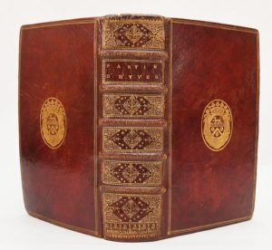 BREVIAIRE ROMAIN en latin et en françois. Partie d'Hyver. Paris, Denys Thierry, 1688. Fort in-4°, maroquin vieux rouge, filets dorés avec armes au centre des plats, dos à nerfs très orné, tranches dorées (reliure de l'époque). Titre gravé. Très bon exemplaire en maroquin aux armes avec la devise « fin-che-venga ». (Guiguard II, 344). Provenance : Exemplaire aux Armes de Lorenzo Marziani, prince de Furnari en Sicile.