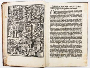 [CHARTREUX] - [DUPUY (François)]. Vita Beati Brunonis confessoris. (Bâle, J. Froben, vers 1515). Petit in folio gothique de 54 feuillets (a6-d6-e5-f6-i6) et un feuillet non signé impr. recto verso, basane brune, dos à nerfs (reliure ancienne). TRES RARE. Première édition illustrée d'une gravure sur bois représentant l'arbre généalogique des chartreux, puis au verso les 9 petits bois de la fondation de l'Ordre (Les 2 identiques à l'édition des Statuts, au numéro précédent) mais sans les légendes. Le prologue encourage les membres de l'ordre à ne pas cesser de chanter les louanges des chartreux illustres, suit la biographie de Bruno, un long poème de l'auteur de la nef des fous, Sébastien Brant, puis 3 pages sur l'origine de l'Ordre par l'humaniste suisse Henri Glaréanus et enfin le dernier feuillet, qui semble manquer à de nombreux exemplaires de bibliothèque, contient la lettre de Léon X, signée par son secrétaire Jacques Sadolet et adressée au prieur général interdisant aux membres de l'Ordre de quitter la Maison sans permission pontificale. Il n'y a pas de feuillet e1, comme celui de l'exemplaire numérisé par l'USTC (n° 743716). Annotations et corrections manuscrites de l'époque, quelques défauts sans gravité. (H. Elie, les éditions des statuts... 1943, p. 14-15).