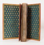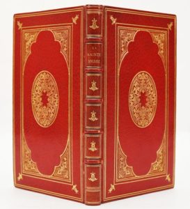[LANDRY (Pierre)]. La Sainte Messe ou sont représentés par les actions du prêtre les mystères de la Passion de Notre Seigneur Jésus-Christ. Paris, Pierre Landry, (vers 1650). In-12 de73 feuillets, maroquin rouge, double encadrement de filets dorés sur les plats avec fleurons dorés aux angles et motif doré au centre, dos à nerfs orné, doublures de maroquin bleu orné de fleurs de lys dorées, tranches dorées (Ch. de Samblanx 1918). Rare ouvrage procuré par le graveur Pierre Landry, constitué de 38 pages de texte et de 35 figures gravées au burin et imprimées sur un seul côté. Charmante reliure doublée de Samblanx (1855-1943), relieur belge. Un mors fendillé.