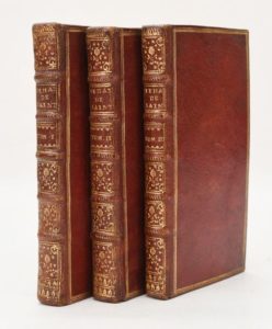 [LA SALLE (Antoine de)]. L'Histoire et plaisante cronicque du petit Jehan de Saintré, de la jeune Dame des Belles Cousines sans autre nom nommer. Paris, chez Guillaume Saugrain, 1724. 3 volumes in-12, maroquin vieux rouge, encadrement de filets dorés sur les plats, dos à nerfs orné, tranches dorées sur marbrure (reliure de l'époque). Édition donnée par Gueulette contenant une préface sur l'origine de la chevalerie et des anciens tournois. Publié pour la première fois en 1517 par Antoine de La Salle, ce récit charmant et un peu cruel mêle roman de chevalerie et fabliau. On y voit une jeune veuve faire l'éducation mondaine, chevaleresque et sentimentale d'un jeune page du roi. Quelques taches sur les plats, l'exemplaire est bien conservé dans de jolies reliures en maroquin de l'époque. (Barbier II, 804, ne cite pas cette édition - Gay II, 562). Provenance : Bibliothèque de la famille Boscary de Villeplaine (ex-libris gravé et la devise Amor patriae).
