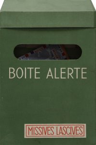 SURRÉALISME.BOÎTE ALERTE, MISSIVES LASCIVES. Exposition internationale du Surréalisme, 1959-1960. (André Breton, Marcel Duchamp). Paris, Galerie Cordier, (décembre 1959). Cartonnage vert en forme de boîte aux lettres, avec couvercle (18 x 28 x...