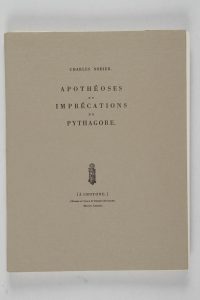 emboîtage. Tiré à 120 ex.+ qq .h.c. sur vélin de Rives gris. Les 6 eaux-fortes sont signées.- Charles NODIER : Apothéoses et imprécations de Pythagore [à Crotone]. Losne, Thierry Bouchard, 1992. In-4 en ff. Tiré à 200 ex. 1/17 sur vélin.