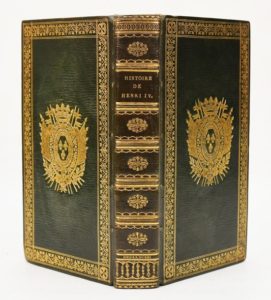 PEREFIXE (Hardouin de). Histoire du Roi Henri le Grand. Paris, de l'imprimerie de Goetschy, 1821. Petit in-8, maroquin vert à long grain, dentelle dorée avec armes au centre des plats, roulette intérieure, dos à nerfs orné, tranches dorées (Simier, R. du Roy). Edition ornée d'un portrait par Coqueret et du fac-similé d'une de ses lettres, dédiée à S.A.R. le Prince Henri, duc de Bordeaux par MM. Paul et Chrestien, éditeurs. Rousseurs sinon bel exemplaire relié par Simier aux armes du Comte d'Artois, futur Charles X. Provenances : Exemplaire aux armes du Comte d'Artois - Monica Soulas de Balcarce (Ex-libris).