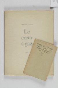 TZARA Tristan.Le cœur à gaz. Paris, GLM, 1946. In-4, br. Tirage limité à 405 ex.Joint :- Vigie. Sixième cahier de « Habitude de la poésie ». Paris, GLM, 1937. Plaquette in-16, br.