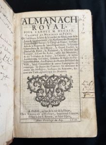 [ALMANACH] Almanach royal pour l'an MDCCXIX. Paris chez d'Houry au Saint-Esprit. In-8 plein veau, dos à nerfs ornés au petit fer de fleur de lys. Pièce de titre et tomaison (usures à la reliures)