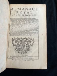 [ALMANACH] Almanach royal pour l'an MDCCLIX. Paris, chez Le Breton rue de la Harpe. In-8 plein veau, dos à nerfs ornés au petit fer de fleurs de lys, pièce de titre et tomaison