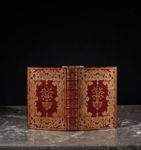 [ALMANACH] Almanach royal pour l'an MDCCLXVI. Paris, chez Le Breton rue de la Harpe. In-8 marocain rouge, grande plaque dorée à motif rocaille et vase fleuri au centre dos à ner fs ornés au petit fer de fleurs de lys (légères usures aux coiffes)