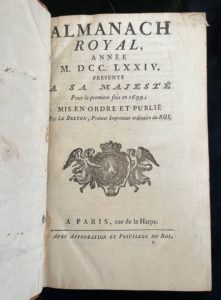 [ALMANACH] Almanach royal pour l'an MDCCLXXIV. Paris, chez Le breton rue de la Harpe. In-8 plein moucheté, dos à nerfs ornés de fleurs de lys, pièce de titre et tomaison (manque à la reliure)