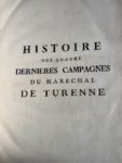 M.Le CHEVALIER de BORIN, géographe de sa majesté Histoire des quatre dernières campagnes du maréchal de Turenne Paris chez de Borin 1782. In- folio veau jaspé, dos à nerfs estampés au petit fer à froid. Deux volumes (deuxième volume de cartes) (nombreux accidents aux reliures)