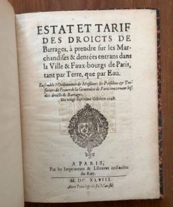 Estat et tarif des droicts de Barrages Paris. 1648. In-8, dos lisse (usures)