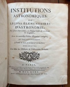 Institutions astronomiques ou leçons élémentaires d'astronomie. Paris chez Hippolyte-Louis Guerin & Jacques Guerin rue Saint-Jacques. 1746. In-4 plein veau, dos à nerfs ornés au petit fer de fleurs et d 'animaux, pièce de titre (usures)