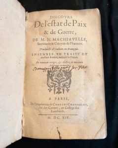 M.Nicolas MACHIAVELLE Discours de l'état de Paix et de guerre. Paris, chez Chappelain rue des …