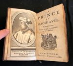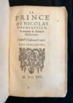 M.Nicolas MACHIAVELLE Discours de l'état de Paix et de guerre. Paris, chez Chappelain rue des Carmes 1614. Fort in-8 plein veau (rousseurs) Joint Prince de Machiavelle troisième édition. Amsterdam, chez Wetstein 1686. Grand in-12, plein veau dos à nerfs