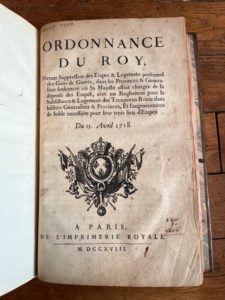 Ordonnance du roi Paris 1718, enrichi d'annotations par le ministre de la guerre. In-4 veau moucheté dos à nerfs ornés au petit fer, pièce de titre