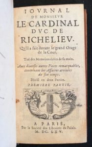 [DUC DE RICHELIEU] Journal de monsieur le cardinal duc de Richelieu. Paris Librairie du Palais 1665. In-12, plein veau blond, dos à nerfs ornés au petit fer. Joint Rousseau les confessions Londres 1782 6 volumes