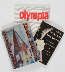 BURROUGHS William et GINSBERG Allen.The Yage letters. San Francisco, City Lights books, 1963. In-12, br.Joints :- Allen Ginsberg. Iron horse. Toronto,The coach house press, 1972. In-8 à l’ital., br. Couverture imprimée sur papier métallisé....
