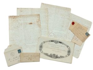 GALLE André (1761-1844) graveur français. Ensemble de 4 L.A.S. à Adrien Vauthier-Galle (son petit-fils) Paris, de la semaine du 30 novembre 1843 au 28 décembre 1843. 6 pp.⅓ . in-folio. Deux lettres avec adresses, marques postales, cachets (déchirures au niveau des cachets). Étonnante et intéressante correspondance entre André Galle (graveur et inventeur de la chaîne à maillons avec engrenage) et son petit-fils maternel Le graveur et médailleur André Vauthier-Galle (1818-1889). Tel un rapport de la semaine passée, ces lettres donnent un léger aperçu de la politique générale de l'époque, de celle des beaux-arts, des nouvelles de la famille. L'ensemble des documents traite de l'envoi tant attendu d'un bas-relief et du retour d'André Vauthier-Galle. La première lettre numérotée 136 datée du jeudi 30 novembre au 8 décembre, débute ainsi «Voilà, je pense l'avant dernière lettre que je dois t'adresser à Rome, à moins que des circonstances que je ne puis prévoir me forcent à entamer de nouveau une rame de papier, cela dépend de ta volonté et de la proposition où s'est engagé Monsieur Adrien Vauthier, je présume que la première qui me parviendra m'indiquera la conduite que je devrai tenir [...] Notre Chambre des députés reprend ses séances le 27 du mois prochain. il parait que le ministre ne sera point changé et que Monsieur Laplagne sera conservé aux finances, le timbre dépend de son ministère c'est toujours un bon point pour nous.[...]» il poursuit en évoquant son retour et montre son impatience «voilà le premier jour du dernier mois où vos engagements respectifs entre le Gouvernement et toi [...]» il annonce que le modèle qu'il doit recevoir n'est toujours pas arrivé «Je ne comprends toujours rien, s'est-il égaré en route ? [...]» il raconte sa dernière séance à l'Institut et insiste sur le modèle qui est toujours absent. André Galle insiste, il ne comprend pas le silence de son petit-fils et ajoute «[...] Ce modèle promis et attendu n'est point arrivé et maintenant il est presque inutile de l'attendre. Comment espères-tu remplacer ce travail [...]» le jeudi 7 décembre, il lui indique «Cette lettre partira demain et je présume qu'elle est l'avant dernière que je t'adresse, il est bien tems. Ta présence fixe le terme de cette correspondance. Car la présente porte le n° 136 et cela en vaut la peine et mérite qu'on se repose [...]» ; n°137 du 9 décembre 1843 au lundi 18 décembre, il lui reproche des lettres trop courtes et évoque de nouveau «la petite copie» qu'il attend avec impatience. Il poursuit ensuite avec ses activités, l'Institut, le vote pour l'élection d'un maire et d'un adjoint, il va «aller au timbre porter une griffe», il est «convoqué à la monnaie, de la à l'institut, ou nous devons nommer un bibliothéquaire (sic) à la place de ce responsable Monsieur Feuillet [...]» etc... il poursuit «J'ai reçu hier une petite lettre qui m'annonce que tu m'as envoyé dernièrement une caisse contenant une petite peinture et deux plâtres [...]» et s'inquiète «De quelle grandeur est ton modèle? si je dois le réduire par Colas, cela demandera du tems, après il faudra faire fondre cette réduction ce qui prendra du tems, la() sur acier je ne sais quel est ton relief et te l'envoyer tout cela prendra au moins cinq ou six semaines après cela le temps de graver [...]» ; n° 138 du 20 décembre 1843 au lundi 25, il est principalement question de cette fameuse caisse «[...] que te dirai je sinon de chanter sur le même diapason, j'attends la caisse, j'attends la caisse [...]» ; n° 139 du 26 au 28 décembre, «Enfin cette petite caisse que nous croyons perdue, nous à été rendue hier au soir entre huit et neuf heures [...] maintenant il faut arrondir le champ, la faire fondre et la réduire, ce qui prendra une quinzaine [...]» il conclut en scandant «Revient nous attendons ; ton petit portrait qui est fort bien fait, ne nous suffit pas c'est l'original qu'il nous faut. Revient, Revient, Revient ! [...]» La fin de la lettre est de la main de J. Oudiné. Il lui demande un service «M. Constant Dufeux que j'ai vu hier me charge de te demander si tu pouvais lui apporter une coquille pour faire une broche [...] Je relis ce que papa Galle vient de t'écrire au sujet de Blondel et de Raoul Rochette ; fiche-toi de tout ça et fais ce que tu voudras ; Ton modèle est au fondeur nous te l'enverrons aussitôt qu'il sera prêt. Eugène va se dépêcher à le réduire ; [...]». On joint diverses correspondances adressées à André Galle et Adrien Vauthier-Galle. Une lettre avec de belles illustrations.