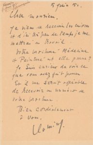 VLAMINCK Maurice de (1876-1958). L.A.S. «Vlaminck», [à Maurice Girardin ?] (s.l.), le 5 juin 1951. 1 p. petit in-4. À propos de l'envoi d'une revue de médecine et de peinture «Cher monsieur, je viens de recevoir les cuivres et d'ici très peu de temps je me mettrai au travail. Votre prochaine «Médecine et Peinture» est-elle parue ? Je suis curieux de voir ce que vous avez fait passer. Et il me serait agréable de recevoir un numéro de votre brochure [...]».