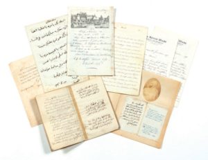 ABD-EL-KADER Sidi-el-Hadji-Ouled-Mahiddin (1807-1883), célèbre défenseur de l'Algérie contre les Français. Très bel ensemble de 6 L.A.S. en Français ainsi qu'en Arabe rédigées durant son exil. L.A.S. au capitaine Fournier, ½ p. in-4, cachet. «À notre très cher ami et bien aimé compagnon, le brave capitaine Fournier, que Dieu le protège ! J'espère que la présente te trouvera toujours en bonne santé [...]» ; L.S. de son cachet au roi Louis Philippe, 2 mars 1839, 1 p. in-folio. Traduction française. L.A.S. à M. André, receveur général d'Indre-et-Loire. Ambroise, 15 juillet 1849. 1p in-folio. Manuscrit autographe, 5 pp. in-12. Petit carnet renfermant les pensées ou réflexions philosophiques écrites par Abd-El-Kader durant sa captivité au château d'Amboise. On a joint une traduction en français par son interprète Rousseau, deux L.A.S. adressées à Abd-El-Kader, 6 pp. in-folio sur papier à en-tête de «La Revue Mame» ainsi qu'un ensemble de 6 articles de journaux.