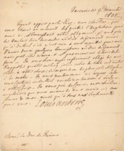 ANGOULÊME Louis-Antoine d'Artois, duc d'. (1775-1844). Duc d'Angoulême, fils aîné de Charles d'Artois, futur Charles X. L.A.S. au duc de Piennes. Varsovie, 9 décembre 1802. 1 pp. in-4 ; deux déchirures, dont une avec atteinte du texte. Jolie lettre d'émigration dans laquelle le prince apprend que le duc va quitter l'Angleterre pour le rejoindre et en profite pour le charger de quelques commissions «[...] Connaissant votre obligeance, je vous prie de vouloir bien demander au duc de Gramont ainsi qu'à Dutheil, s'ils n'ont rien à vous remettre pour moi [...]. Je vous serai aussi infiniment obligé de me rapporter quatre ou cinq jolies robes de toiles ou d'autre chose à votre choix ; de ce qui sera le plus joli et le plus à la mode. Je vous rembourserai ici ce que cela vous coûtera, ou Dutheil vous le remboursera à Londres, à votre choix [...]». Il transmet les bons souvenirs de son épouse Marie-Thérèse de France.