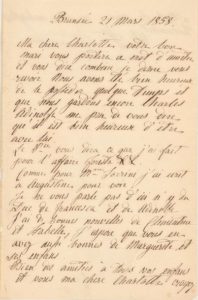 BERRY Marie-Caroline duchesse de (1798-1870). Fille du Roi des Deux-Siciles, épouse du duc de Berry, mère du comte de Chambord. L.A.S. «Caroline» à Charlotte de Bourbon, princesse de Faucigny-Lucinge à Turin. Brunsee, 21 mars 1858. 1 pp. ¼ in-8, joint son enveloppe avec cachet de cire rouge à ses armes (estompées). Lettre affectueuse de la Princesse, à l'aînée des filles naturelles du duc de Berry, qu'elle avait élevée au Palais, après l'assassinat du duc. «Ma chère Charlotte, votre bon mari vous portera ce mot d'amitié et vous dira combien je désire vous revoir. Nous avons été bien heureux de le posséder quelque temps et que nous gardons encore Charles. Adinolfe me prie de vous dire qu'il est bien heureux d'être avec lui. Le Pce vous dira ce que j'ai fait pour l'affaire Foresta &c &c. [...] Je ne vous parle pas d'ici ny du Duc de Francesca et de Adinolfe. J'ai de bonnes nouvelles de Clémentine et Isabelle. J'espère que vous en avez aussi de bonnes de Marguerite et ses enfans [...].»