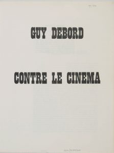 DEBORD Guy.Contre le cinéma. S.l.n.d. In-4, br. couverture métallisée argent. Contrefaçon pirate, illustrations en moins, de l’édition originale, tout aussi rare.