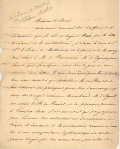 [BERRY Duchesse de]. MONTBEL Guillaume baron de (1781-1861). Ministre et conseiller de Charles X. L.A.S. à M. le Baron. Prague, 18 avril 1833. 2 pp. in-4, légers petits défauts et restaurations au pli. Intéressante lettre politique peu après l'expédition de la duchesse de Berry, dans laquelle l'ancien ministre annonce la prochaine déclaration de Charles X en exil, avec le soutien de l'Autriche «Nous avons terminé hier l'affaire de la déclaration que le Roi a signée [...]. J'adresse le tout à S.A. le Prince de Metternich en le priant de les envoyer sans retard à M. de Neumann [...]». Il fait part du départ prochain du comte d'Agoult pour Francfort, il demande d'intervenir auprès de M. de Haendel pour délivrer un passeport à son domestique qui devra être désigné comme marchand. «M. d'Agoult est connu de M. de Haendel et de plusieurs personnes à Francfort. Aussi, il est essentiel qu'il n'y séjourne pas. Comme son intention est de retourner en France, il demande, si la déclaration venait à donner lieu à une correspondance diplomatique, de n'être jamais désigné par son nom mais par celui de Charles Dufour. J'ai parlé au Roi de l'assistance et des conseils éclairés et bienveillants que vous avez bien voulu me donner dans toute cette affaire. Il m'a chargé spécialement de vous en remercier de sa part [...]».