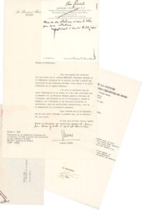 CHIRAC Jacques (1932-2019) Premier ministre et chef de l'État. L.D.S. à Madame A. Grès. Paris, le 25 mai 1987. 1 p. in-folio sur papier à en-tête. L'interlocutrice y recommande Jacques Mouclier pour la prochaine promotion d'Officier de la Légion d'Honneur. «Vous avez appelé mon attention sur les titres que M. Jacques Mouclier, Président délégué de la Fédération française de la Couture, du Prêt à porter des couturiers et des créateurs de Mode, s'est acquis à la croix d'Officier de la Légion d'Honneur. J'ai pris la meilleure note de votre intervention en sa faveur et c'est très volontiers que je demande à M. le ministre auprès du ministre de l'Économie, des Finances et de la Privatisation chargé du commerce, de l'Artisanat et des Services d'examiner sa candidature, avec une particulière bienveillance, lors de la préparation de la prochaine promotion [...]». Une carte de visite adressée à A. Grès agrafée joint la lettre. «Cher présidente, merci de vos attentions et voici la lettre que nous attendions». On joint une L.D.S. de Madame A. Grès adressée à Monsieur Jacques Chirac. Paris, le 29 juin 1987. 1 page in-folio sur papier à en-tête de la Fédération française de la couture. Elle y remercie le Premier Ministre «pour la diligence avec laquelle vous avez répondu à ma dernière lettre dans laquelle je vous demandais de bien vouloir faire examiner les titres que Monsieur Jacques Mouclier, notre Président Délégué s'est acquis à la Croix d'Officier de la Légion d'Honneur [...].»
