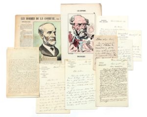 COMMUNARDS et HOMMES POLITIQUES. Ensemble de 9 documents. BUISSON Ferdinand (1841-1932) 2 L.A.S. à Édouard Petit et son épouse, Paris, 2 avril 189[0] et (s.d). 8 pp. in-8. Le 2 avril il remercie M. Petit de lui avoir communiqué ses «coupures de journal» et ajout «Vous arriverez bientôt à être un des deux ou trois hommes qui connaîtront réellement les écoles et le monde des écoles [...]», à son épouse le 20 novembre lui écrit non sans tristesse «j'ai trouvé le temps de lire [...] ce beau livre, le testament de votre mari. [...]» ; COMBES Emile (1835-1921) L.A.S. et N.A.S., Tours le 16 octobre 1895 et (s.l.n.d.). 1 p. et 2 demi-pages in-8. Le 16 octobre, il s'inquiète de la santé du président ; sur un papier à l'en-tête «Le Cri de Paris» une note collée indiquant «Il n'est pas de tribu plus précieuse pour un homme au pouvoir qu'une humeur égale [...] pour la conserver que la mise en pratique du vieil adage : Fais ce que dois, advienne que pourra» ; CAILLAUX Joseph (1863-1944) L.A.S., Paris, 5 septembre 1911. 2 pp. in-16. Il félicite son correspondant et espère que cette lettre lui parviendra bien ; DELESCLUZE Charles (1809-1871) 2 L.A.S. (s.l.n.d.) 3 pp. ½ in-16. «Mardi» il s'agace «Pourquoi n'allez-vous pas vous aussi à la préfecture demander un permis ? Adressez-vous au préfet, si les bureaux vous repoussent. Je ne suis pas condamné au Carrière dure que je sache. Je vais du reste employer les grands moyens pour faire lever cette interdiction» et (s.d.) «Quand sortirai-je ? Je n'en sais rien, car on sait bien quand on entre en prison [...] Je serai bien heureux si je n'ai pas de nouvelle condamnation.» ; FLOURENS Gustave (1838-1871) L.A.S. (s.l.) 3 juillet 1869. 1 p. in-8. Lettre traitant d'intendance ; MICHEL Louise (1839-1905) L.A.S. au «citoyen Lueroin» (s.l.n.d.) 1 p. in-12. Adresse, quelques déchirures. Elle demande un service «on me demande (de suite) l'histoire de Mandrin pouvez-vous m'envoyer prendre à la bibliothèque tous les documents sur lui, procès, manuscrits [...]» Louis Mandrin, contrebandier français ; VAILLANT Édouard (1840-1915) 2 L.A.S. Rangate 4 mars 1872 et Paris 22 novembre 1899. 2 pp. ½ in-8. Le 4 mars 1872, belle lettre dans laquelle il évoque les conséquences de la Commune de Paris pour ceux qui l'ont organisé et soutient les idées de son correspondant «Je vois avec peine que comme tous ceux qui ont fait leur devoir et ont pris la cause du peuple contre ses détestables ennemis vous avez eu à souffrir et porter comme nos pauvres amis condamnés la peine de notre défaite [...] Votre idée d'établir une école laïque venant battre en brèche l'empoisonnement clérical de la jeunesse est excellent [...] ; le 22 novembre 1899 il apporte son aide à son correspondant. On joint deux imprimés : L'article «Les hommes de la Commune, par Alfred Lepetit» sur Delescluze ainsi qu'un portrait charge de celui-ci.