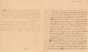 DAVOUT Aimée. (1782-1868). Sœur du général Leclerc (†1802, beau-frère de Napoléon), épouse du maréchal. L.A.S. à son mari, le maréchal Davout. [Paris], 8 mars [1813]. 3 pp. bifeuillet in-8 carré. Émouvante lettre de la Maréchale Davout, donnant des nouvelles de ses enfants. «Mon Louis, je n'ai pas eu de lettre de toi aujourd'hui. Il me semble que l'estafette prend la vilaine habitude de ne partir que tous les deux jours de Magdebourg [...]. Je ne jouis pas bien de nos enfants en ton absence. Louis est délicieux, mais il me fait dire plus de cent fois par jour que si son père était témoin de tant de gentillesse, il serait trop heureux. Elle lui adresse le Journal de Paris tout déchiré ; [...] Ce cher enfant le lisait, je lui ai demandé ce qu'on dit ; il m'a dit «Rurusse font la guerre et empêchent Papa de venir. Méchants !» a-t-il dit en frappant du pied. Et il a déchiré avec toute la vivacité possible ce journal, qu'il a trouvé plein de mauvaises nouvelles pour lui. Ce bon enfant est constamment occupé de toi [...]». La maréchale donne des nouvelles d'une parente venue la voir et de «bouton de Rose» heureuse à la vue des chevaux «C'est une Joséphine pour l'intelligence [...]. Jules rit déjà comme un petit fou [...] Toutes les craintes qu'il m'a données me l'a rendu bien plus cher encore [...] que lorsqu'on a été en danger de le perdre [...]». Etc.