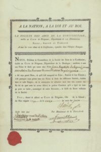 EMPIRE FRANÇAIS. Ensemble de 2 passeports du département de la Dordogne, délivrés au citoyen Jouassain, datés du 2 avril 1806 et du 25 mars 1807. On joint un diplôme de «La société des amis de la constitution» établie au club de Périgueux, département de la Dordogne, signé avec sceau en bas à gauche, le 11 juin 1791 au bénéfice de Jean-Baptiste Beleymé.