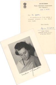 GANDHI Indira (1917-1984). 2 documents. Portrait noir & blanc, signé (11,7 x 15 cm) ; CRISHNA (Amie) L.D.S. avec deux annotations, New Delhi, 22.11.1975. 1 p. in-12. En-tête gravé. Elle annonce l'envoi de la photographie signée, présentée précédemment. Amie Crishna secrétaire personnelle d'Indira Gandhi.