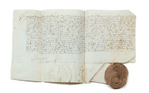 [HENRI II (1519-1559) roi de France]. Acte fait en son nom, Fontainebleau, 1er novembre 1547. 1 p. gd in-folio oblong (51 x 26 cm) sur vélin. Grand sceau du Roi en bon état. Acte rédigé au nom du roy «Par le roy en son conseil» le «1er de notre règne» au bénéfice du connétable de Montmorency. Ce document coïncide avec le retour en grâce de celui-ci. Il reçoit les terres de Planganeul, Malestruit et Fougères. Le mandement au dos du document indique «pour prendre position sur le Seigneur de Châteaubriant».